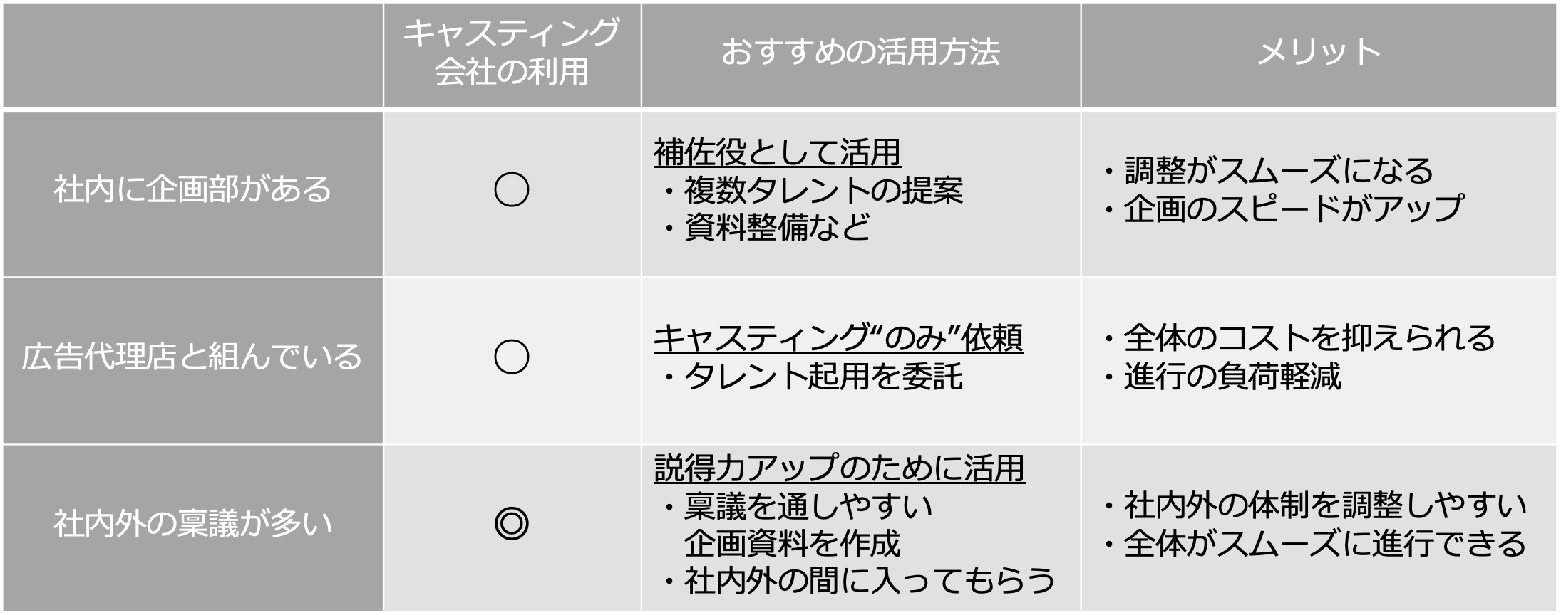 こうした背景から「誰を選ぶか」の部分だけでなく、「どうやって選び、どう活かすか」までをサポートできるキャスティング会社の存在価値が改めて注目されています。