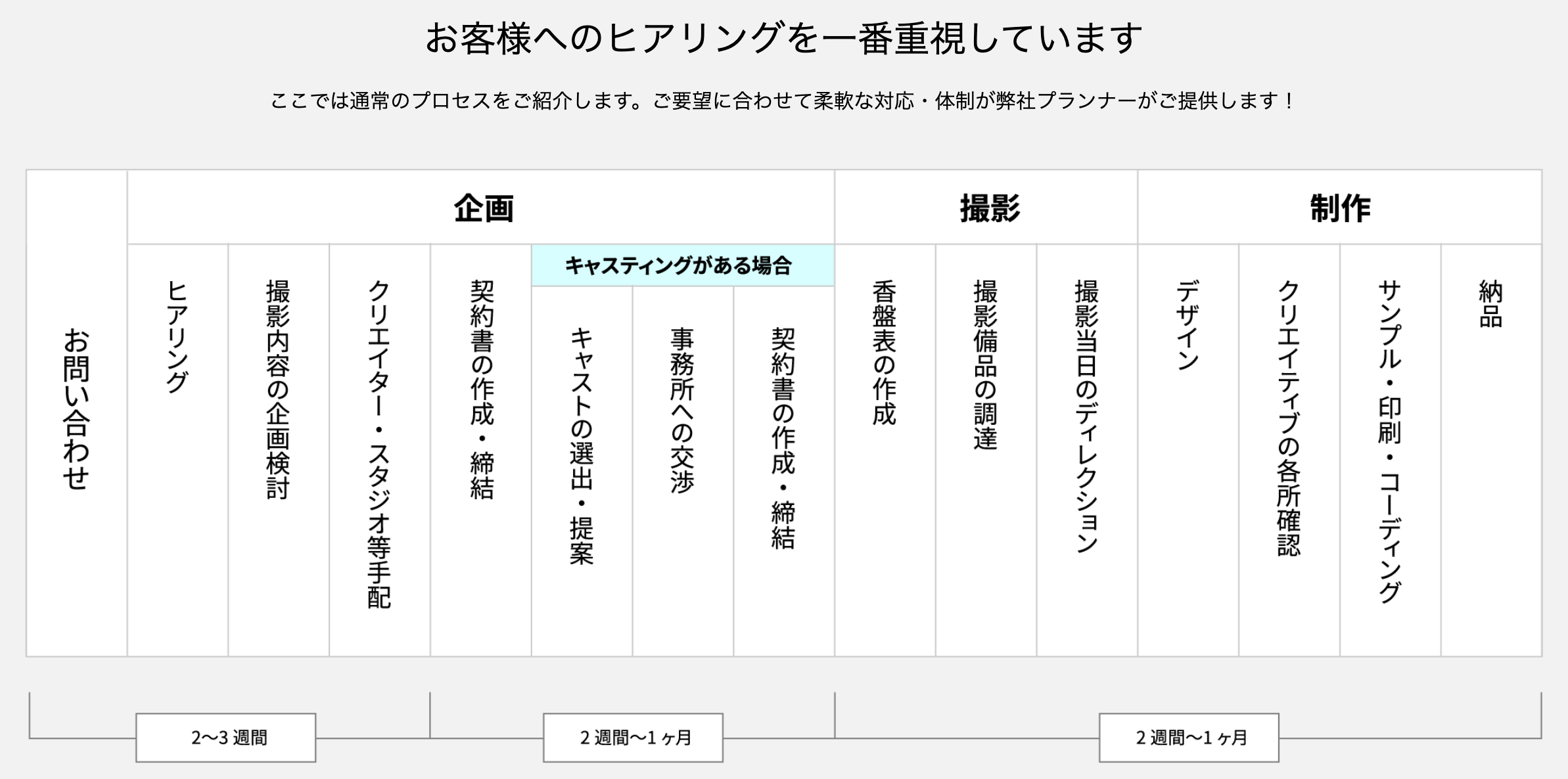 皆さまに丁寧にヒアリングをし、企画の目的や意図を把握したうえで、施策を成功に導くためのお手伝いを、ぜひ私たちにさせてください。