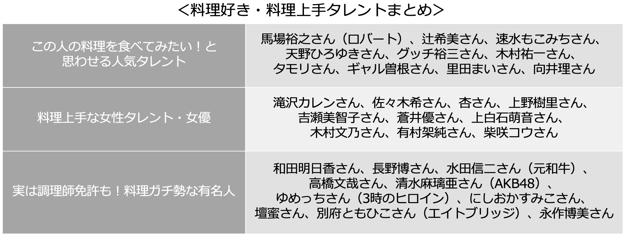 料理好き・料理上手なタレントは、料理のスキルがあるのは至極当たり前のことなので、そこだけが評価の全てではありません。料理タレントに限らず、昨今のタレントキャスティングは、そのタレントの“人柄”が起用の理由になることも多くなっています。いくら秀でた才能があっても、好感度がある程度なければ、世間からの評価はなかなか上がらず、せっかく広告やイベントに起用しても思うような効果が得られなくなってしまう場合もあります。