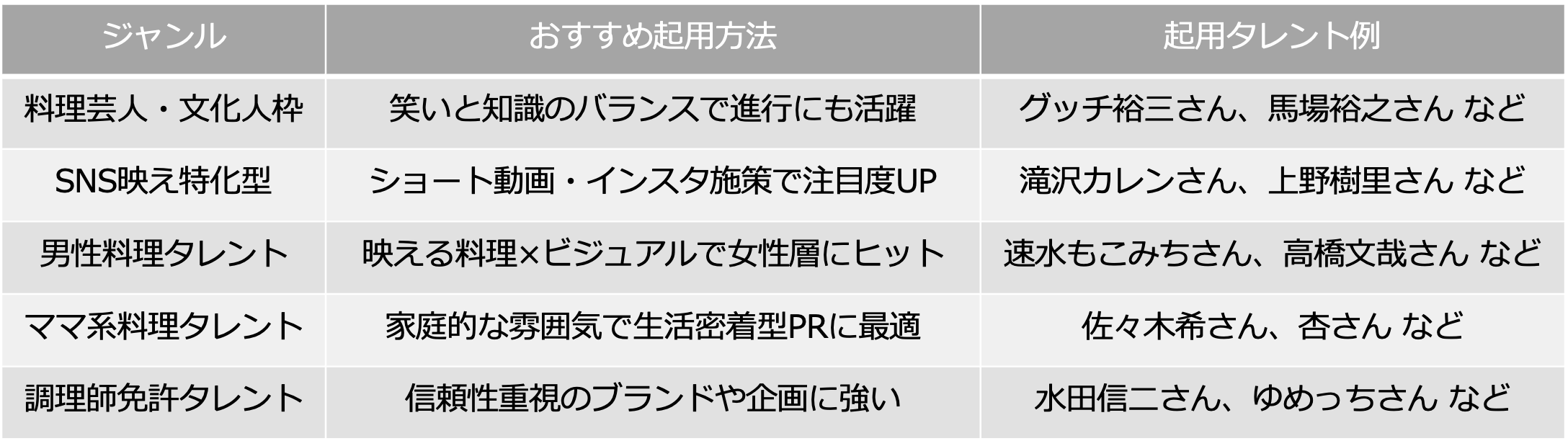 ひとくちに“料理好きタレント”といっても、そのジャンルはいくつも分かれています。さらに、得意な分野もそれぞれ違うため、起用方法によって起用するタレントを判断すると、より効果の高い施策になるかと思います。例えば、SNSによるPRやコラボの場合は普段からSNSで多く発信している料理タレントを選んだ方が、見せ方なども理解しているので案件が進めやすくなります。また、ターゲット層がママ世代の場合は、ママタレントとして活動している料理上手な方を選ぶことで、より一層訴求力がアップします。
