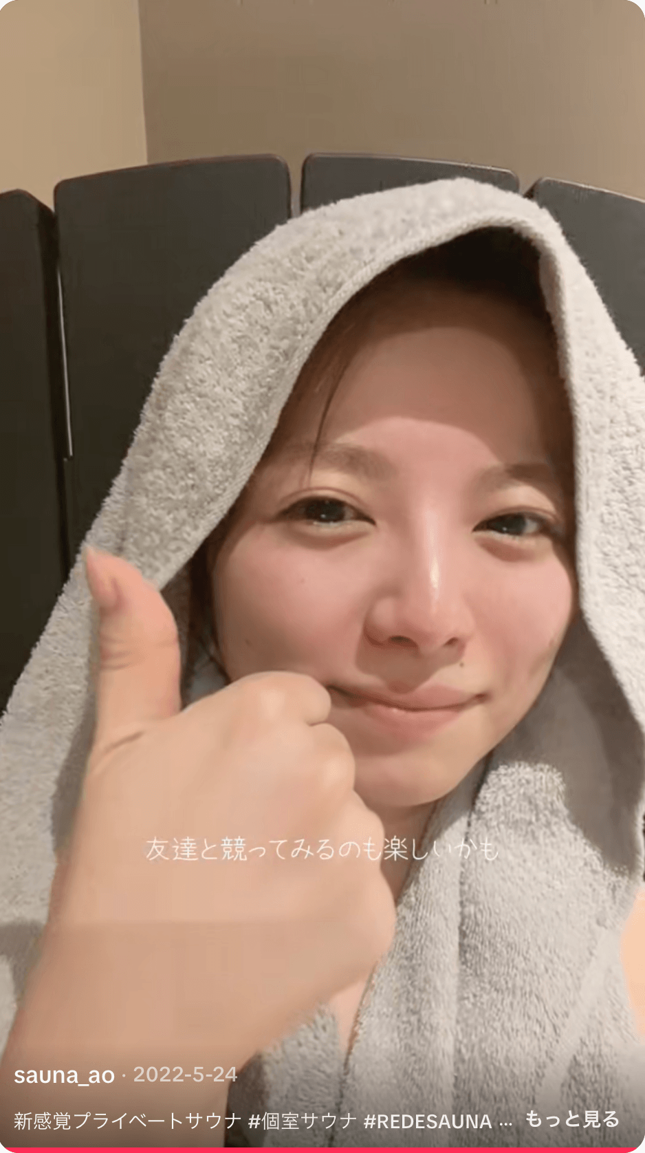 あおサウナさんによるPR投稿で、完全個室サウナ「RED° E-SAUNA」をTikTokにて紹介した事例です。プライベート空間で楽しめる個室サウナの魅力を、TikTokの短い動画尺の中で存分にPRし、主にTikTokを利用している若年層に向けた訴求力の高い案件となりました。