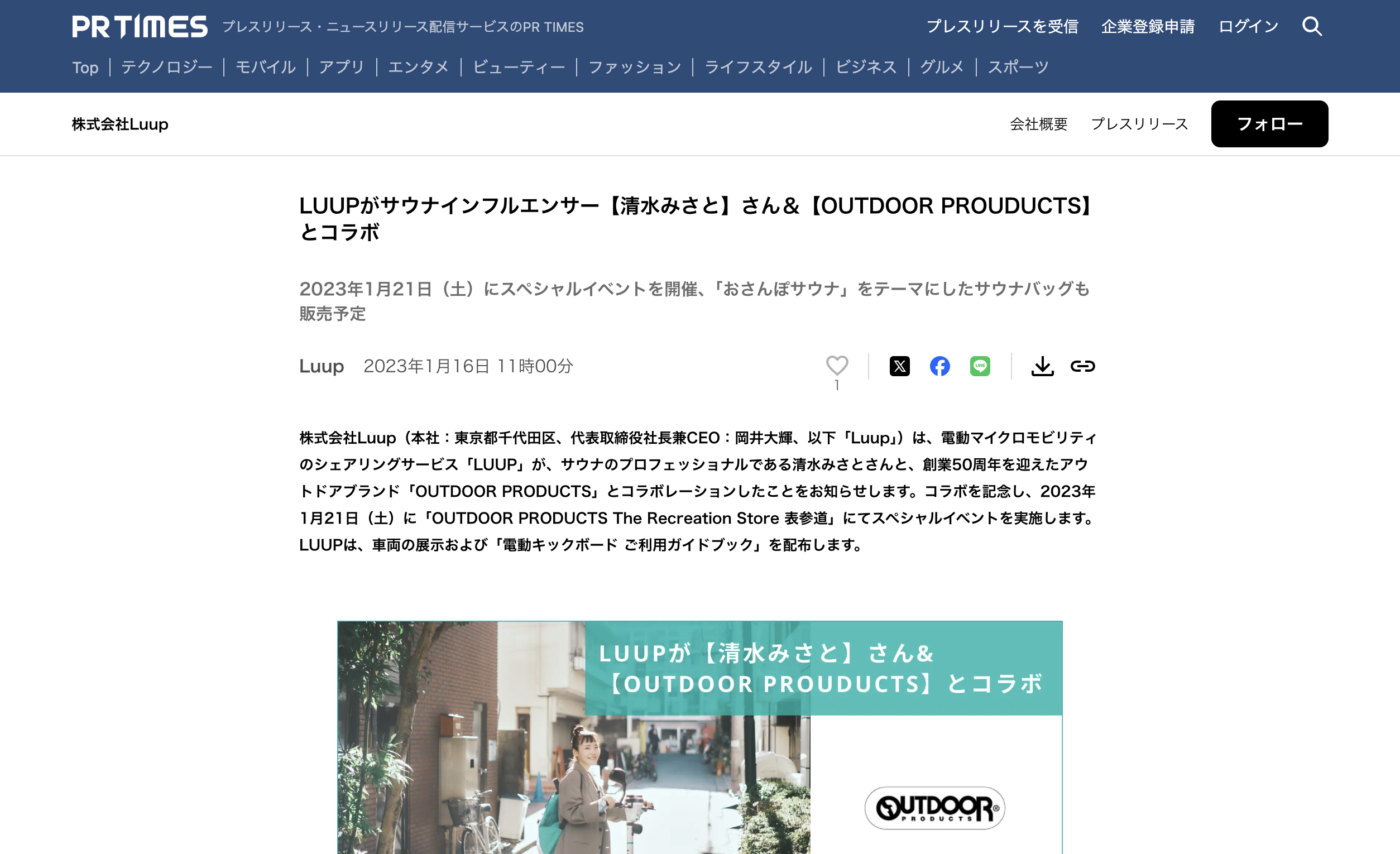 タレント・女優の清水みさとさんが、電動マイクロモビリティのシェアリングサービスを展開する「LUUP」とコラボしたイベント。「LUUP」を使って移動のハードルを下げ、サウナや銭湯に気軽に行く新しいライフスタイルを紹介するもので、清水みさとさんとの親和性が高かったことから、コラボが決定したそうです。イベントではサウナグッズの販売や清水みさとさんによるトークショー、撮影会などが行われました。